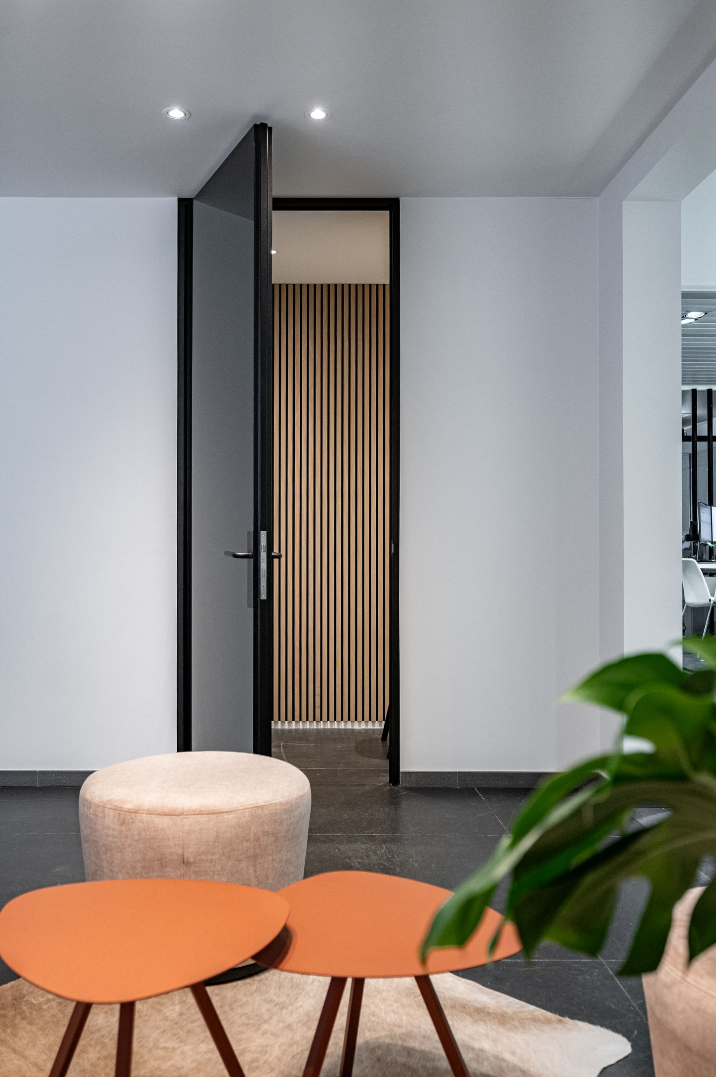 In de vergaderzaal vormt een organisch gevormde tafel het centrale element. In het blad zijn stopcontacten en connectiepunten subtiel geïntegreerd, zodat technologie vlot en onzichtbaar in het geheel opgaat. Het zitcomfort is bewust speels en ongedwongen gehouden, met een combinatie van poefs en comfortabele armstoelen. Dit breekt de formele toon en stimuleert een ontspannen dynamiek tijdens overlegmomenten.