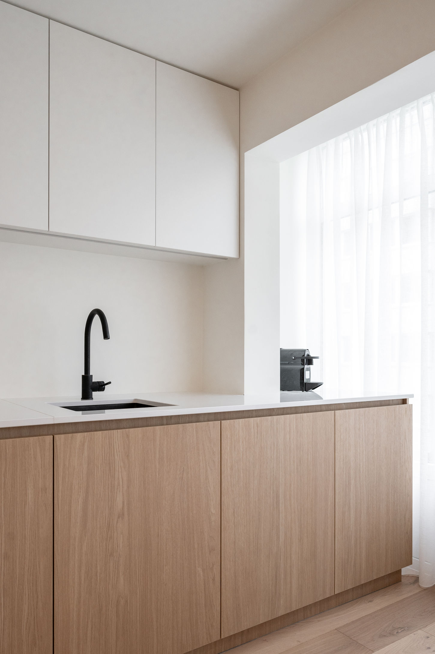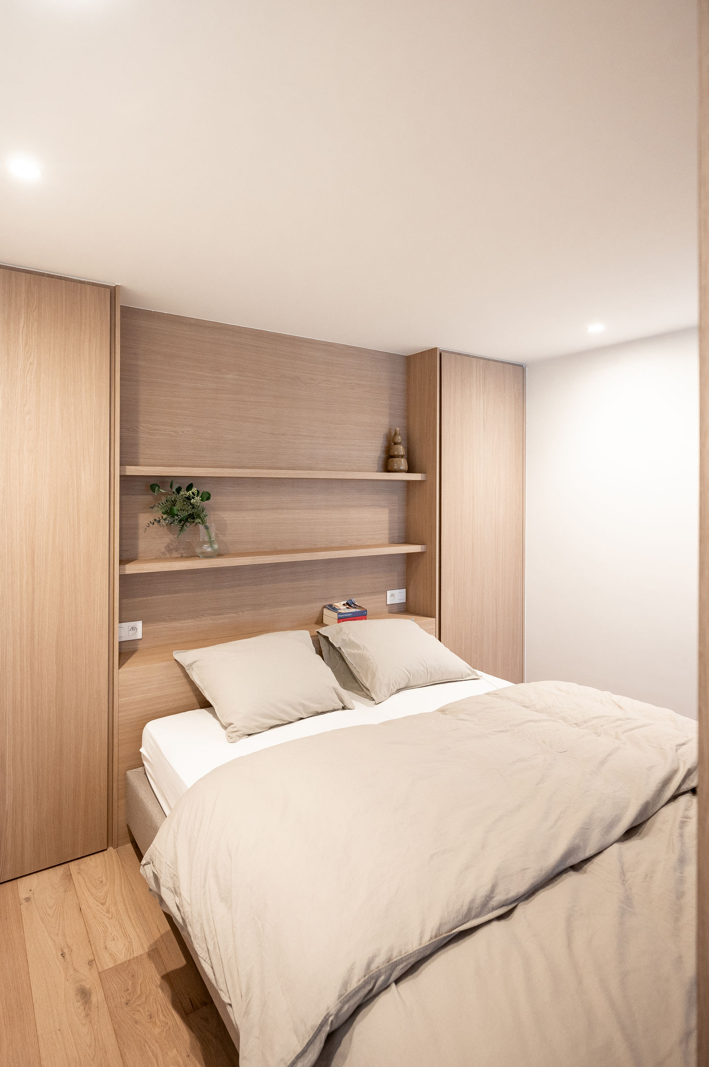 Een subtiele roomdivider scheidt de slaaphoek van de zithoek en zorgt voor een gevoel van structuur. In de inkomhal loopt een reeks ingemaakte kasten over de volledige lengte, waardoor opbergruimte optimaal benut wordt zonder visuele drukte. Kamerhoge gordijnen verzachten het geheel en dragen bij aan een rustige sfeer.